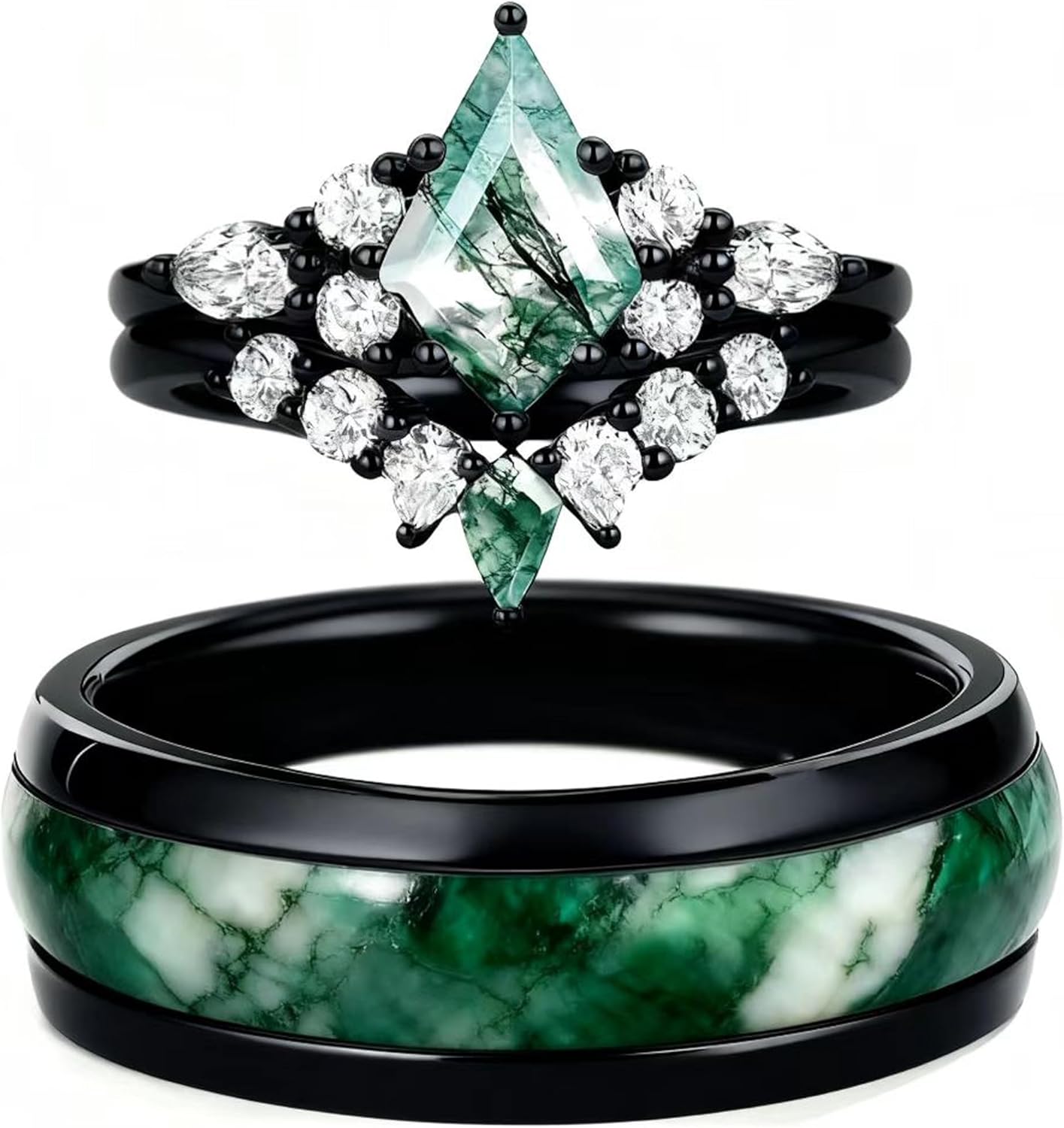 Metal type: 925 Sterling silverTotal Weight (CT. T.W.):2ctClarity:VVS1Stone Type:Moss Agate & MoissaniteStone Color:Green & WhiteMetal Color:Black;Metal Finish:PolishedMetal Type:Platinum Plated Silver