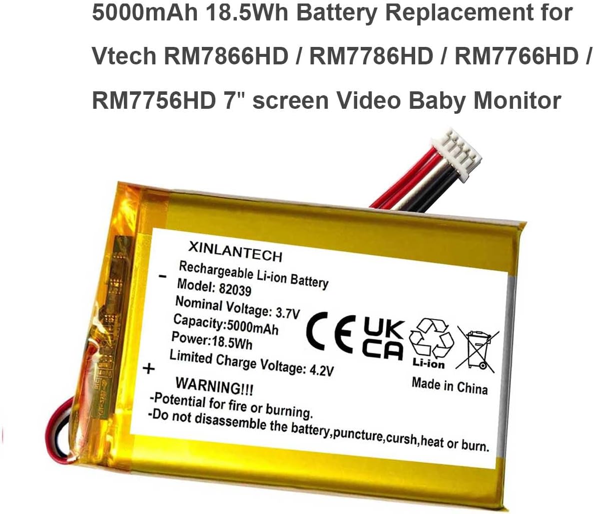Packing List: 5000mAh 3.7v rechargeable lipo battery Pack x 1 Battery Compatible with Vtech Video Baby Monitor Models for - RM5756HD,RM5756-2HD , 5” Smart Wi-Fi 1080p Video Monitor. RM5866HD,RM5866-2HD, 5” Smart Wi-Fi 2K Monitor . RM7766HD.RM7766-2HD, 7” Smart Wi-Fi 1080p Monitor. RM7868HD, RM7868-2HD, 7” Touch Screen Wi-Fi 1080p Monitor. VM5263,VM5263-2, 5” High Definition Baby Monitor. VC2105HD 5” Smart Nursery Over-the-Crib Mount Monitor. VM901, VM901-2, Wi-Fi 1080p Video Monitor. VM928HD, VM928-2HD, Full Color Monitor. VM919HD, VM919-2HD, Full Color Video Monitor. Compatible with LeapFrog Baby Monitor models for - LeapFrog LF915HD, LF915-2HD, 5” Monitor. LeapFrog LF920HD, LF920-2HD, 7” Monitor. LeapFrog LF930HD, LF930-2HD, 7” Monitor. Specifications: Battery Type:Polymer Lithium Ion Rechargeable Battery. Battery Capacity: 5000mAh. Nominal Voltage: 3.7V. Limited charge voltage:4.2 V. Power:18.5Wh.
