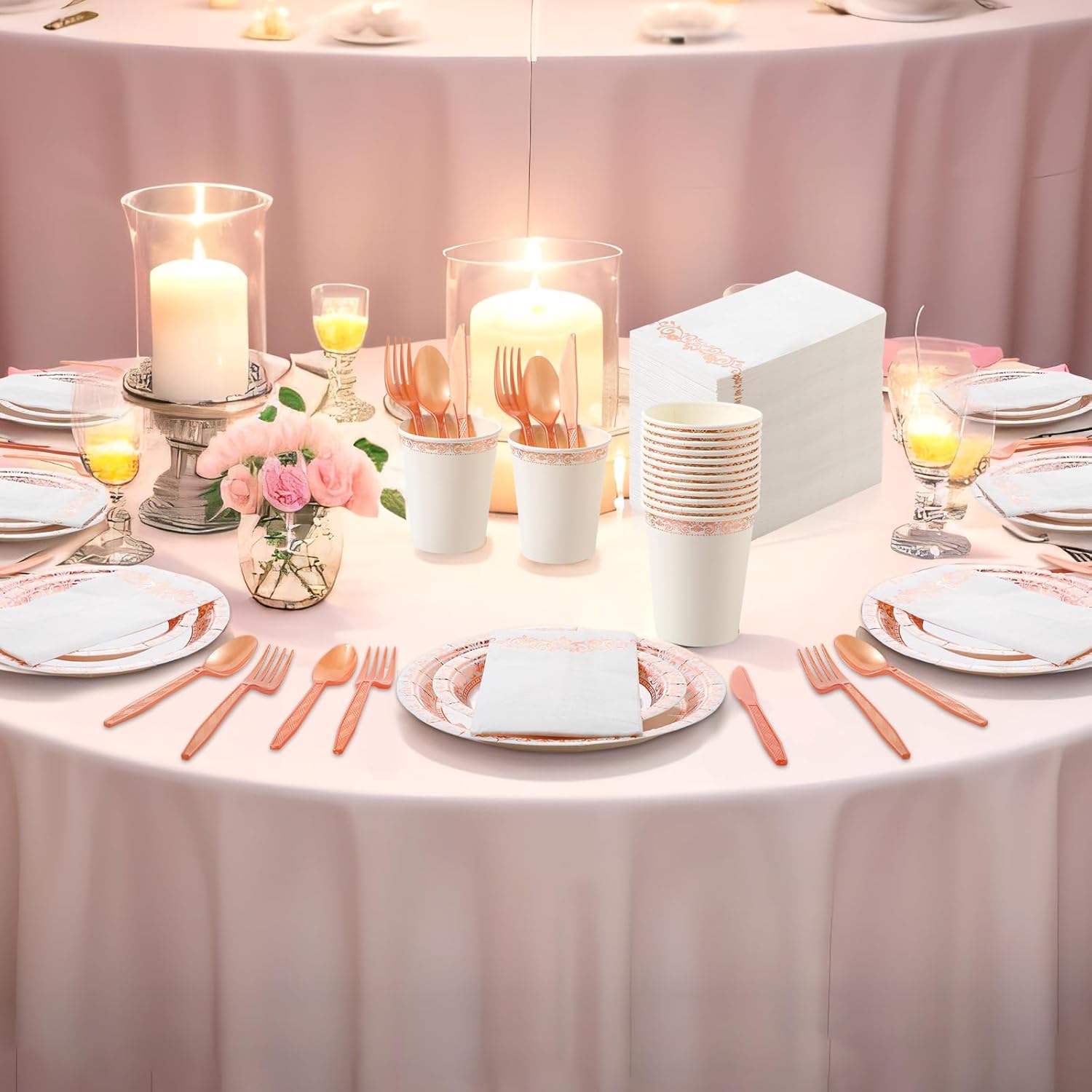Features: Exquisite craftsmanship: Crafted with meticulous attention to detail, our rose gold disposable dinnerware set boasts exquisite craftsmanship that mirrors the elegance of traditional dinnerware, creating a lasting impression on your guests. Versatile sophistication: From grand weddings to intimate birthdays, our disposable dinnerware set brings an air of versatile sophistication to any event, adapting effortlessly to both formal and casual settings. Specifications: Material: paper and plastic Color: rose gold and whiteSize: as shown in the picturePackage includes: 100 x Paper dinner plates 9 inch100 x Paper salad plates 7 inch100 x Plastic forks100 x Plastic knives100 x Plastic spoons100 X 9 oz cups 100 x Paper napkinsNotes: Manual measurement, please allow slight errors on size. The color may exist a slight difference due to different screen displays. Winding accident may exist, please keep it away from little kids.