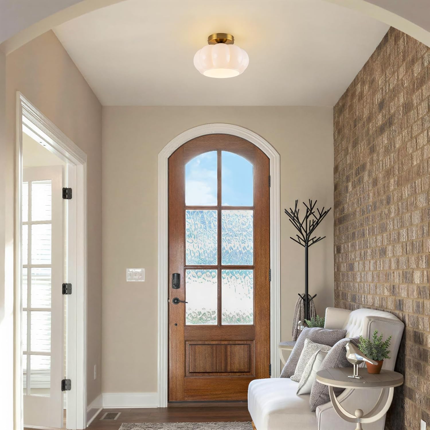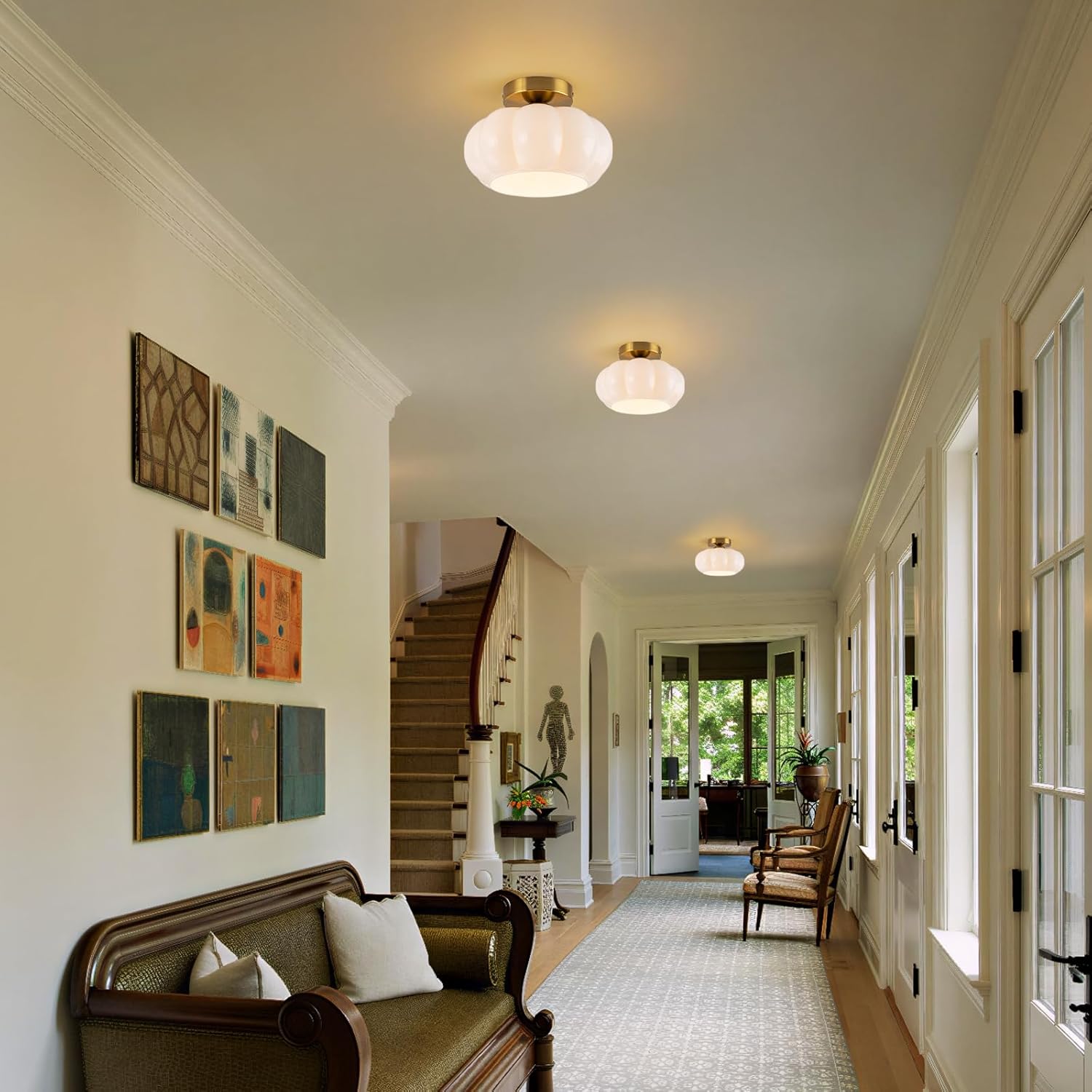 • [Artisanal Design with Eye-Comforting Light]:This hallway light fixtures merges a pumpkin-inspired design with a premium opal glass shade,perfectly blending beauty and performance.It casts a beautifully soft,diffused light that eliminates glare and eye strain.The overall effect is a piece of functional art that brings warm,crafted elegance to your home.
