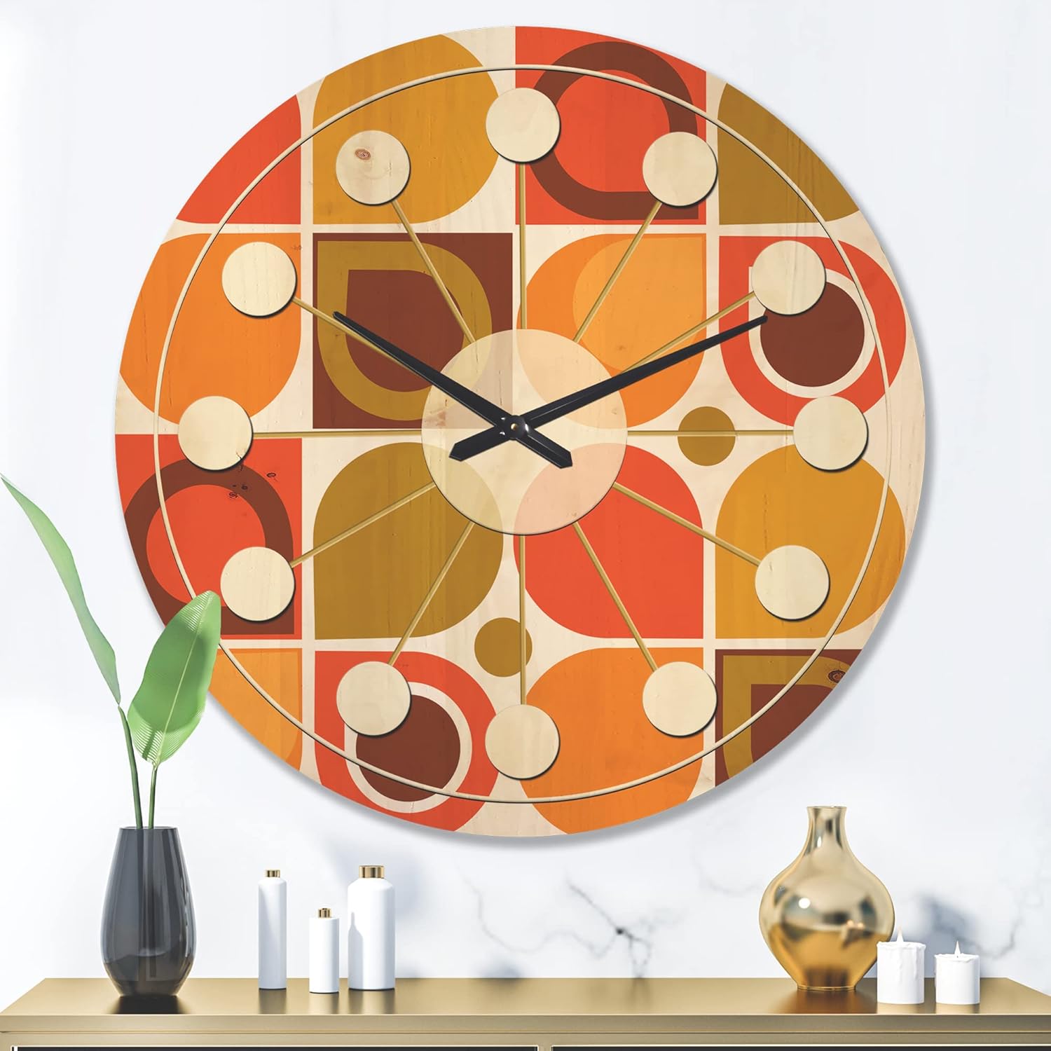 This original Mid-Century Modern round wood wall clock fits in both in rustic decors as well as contemporary spaces. The woodgrain detailing surfaces slightly through the colors of the design, adding to authentic wood character of your artwork wood clock. The Abstract Retro Geometric Pattern Design VI fine art is directly printed on the wood using superior quality 6 Color UV ink, providing an impressive and unique design for your office or home in modern as well as traditional interiors. The natural grain varieties of each panel of wood creates a truly original round wall clock making it the focal point of every room. Features - Style: Mid-Century Modern Type: Wood Wall Art, Fine Art, Wood Fine Art, Print on Plaque - Using the highest quality ink which will not fade over time. - Arrives ready to hang on the wall with hanging kit included - Material: Made with 100% natural pine wood. - Number of Pieces: 1 - Size: Medium, Large, Small - Color: Yellow - Country of Origin: Canada - "AA" battery included with your order. - Easy to hang. See Options drop down for available sizes.