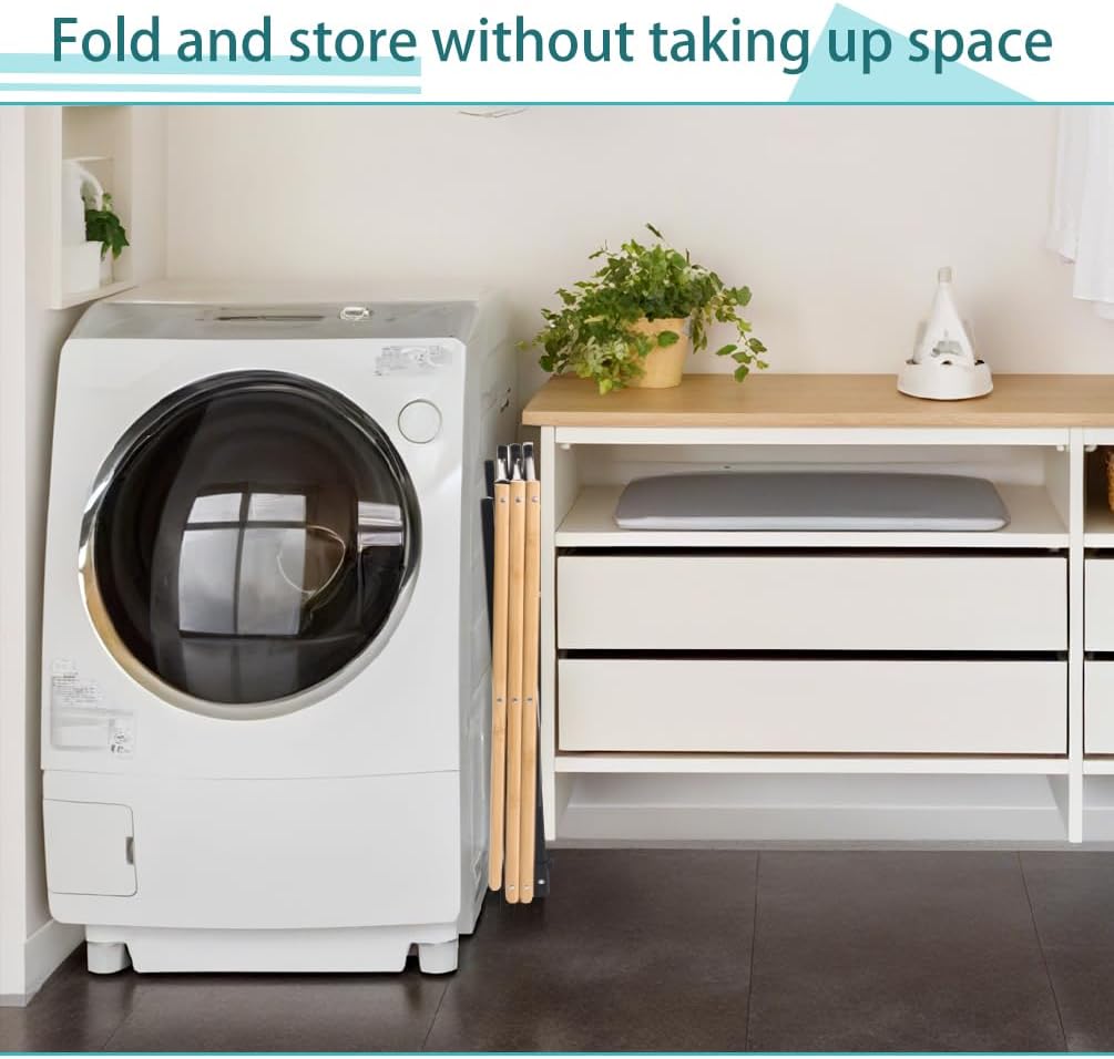 Material: Carbon Steel + PP + Bamboo Size Approx.: Expand---(43-75) X 37 X 105cm/ (16.92-29.52) X 14.56 X 41.33inches; Foldable---51.5 X 9 X 43cm/ 20.27 X 3.54 X 16.92inches Package Included: 1x Clothes Drying Rack