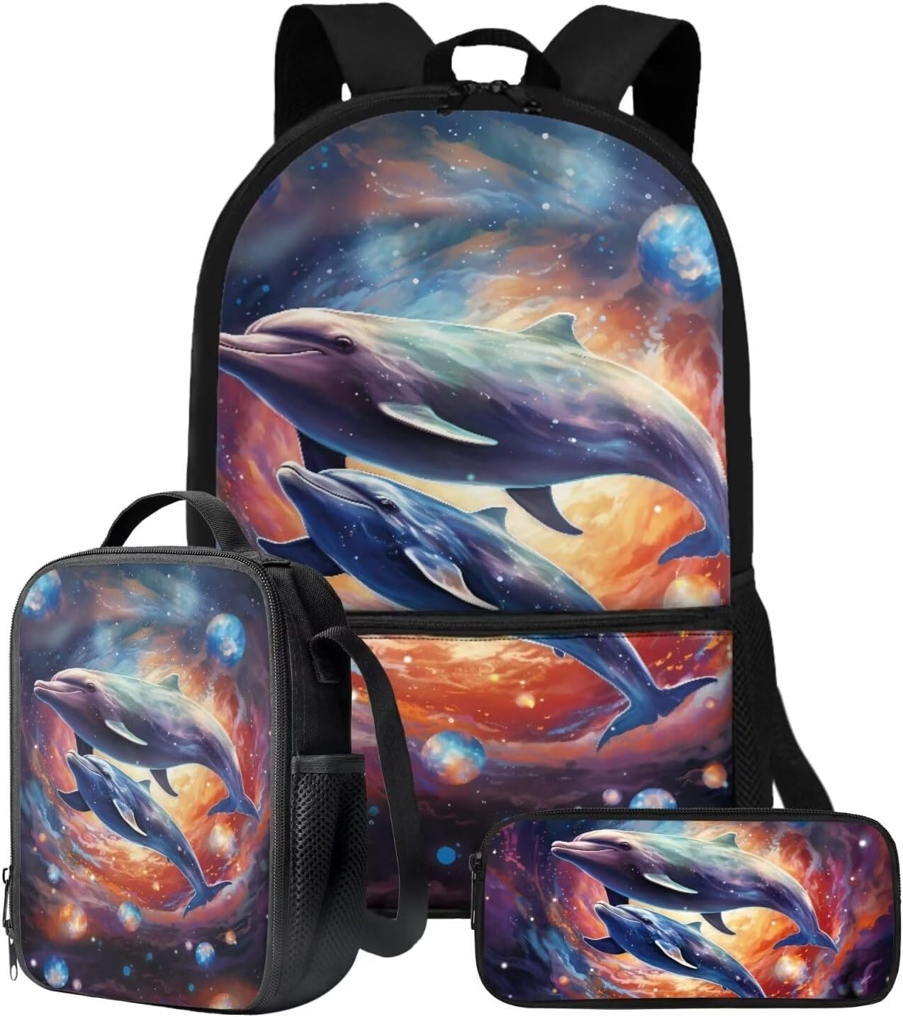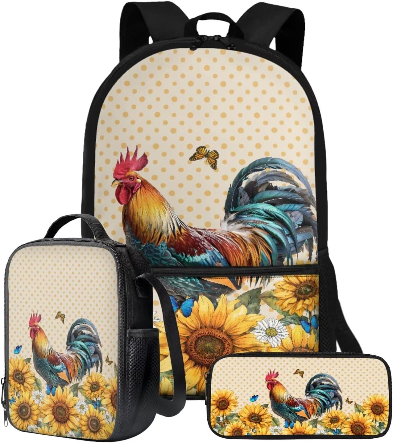 Upgrade back-to-school set with our 3-in-1 backpack set. 17 inch backpackThe Size: 11" L x 5.1" W x 17.3" H ( 28CM x 13CM x 44CM )Material: PolyesterDesign: The spacious 17-inch compartment easily fits laptops, textbooks, and more. The adjustable ergonomic straps lighten shoulder pressure. With 2 mesh pockets, can put sports kettle and umbrella or other little essentials.Lunch BagThe Size: 7" L x 2.7" W x 9" H ( 18CM x 7CM x 23 CM )Material: Polyester fabric and EVA+PE Cotton liningDesign: The material of EVA+PE cotton makes it easy to clean up in case of inevitable spills. A side pockets can storage napkins, handkerchiefs, mouthwash and other supplies. It features a top handle and an adjustable straps for easy carrying.Pencil CaseThe Size: 8.3" L x 1.5" W x 3.9" H ( 21CM x 4CM x 10CM )Material: PolyesterDesign: The pencil pouch just with a zipper compartment, can storage common pens,pencils and other little stationery. Our 3-in-1 backpack set offers a variety of prints to choose from, including cute animals, plants, vintage styles, and more. Select the patterns that match your personality and preferences to make a fashion statement while staying organized. This set also makes a great back-to-school gift for children or friends.Don't hesitate to order our high-quality school bag set now!