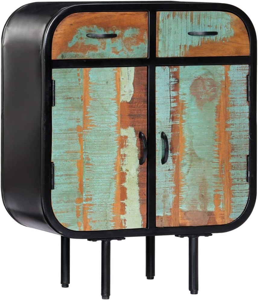 Equal parts sophisticated and elegant, this sideboard gives a nod to a vintage charm and industrial style with its solid reclaimed wood and powder-coated iron frame. Equipped with 2 drawers and 2 doors for ample storage space, this side cabinet will make a truly practical as well as decorative addition to your home decor.The wooden cabinet is made of solid reclaimed wood that has been sourced from joists, floors and support beams from old demolished buildings, and it can consist of different types of wood like sheesham (rosewood), pinewood, teak, beech, oak, cedar, mango wood, acacia, etc. This means the reclaimed wood retains the characteristics of these different types of wood. Reclaimed wood is already aged, weathered and dried, so it doesn"t shrink or bend. The storage cabinet is handmade, and the exquisite craftsmanship adds to its spectacular retro style. Every step of the process is carried out with the greatest care, be it polishing, painting or lacquering. Additionally, the powder-coated iron frame contributes to the stable and sturdy structure and adds to the cabinet"s industrial style as well.Important note: Variations in color and wood grain makes each of our cabinets unique and slightly different from the next; the delivery is random.Material: Solid reclaimed wood + powder-coated ironDimensions: 23.6" x 11.8" x 29.5" (W x D x H)With 2 drawers and 2 doorsPolished, painted, and lacquered