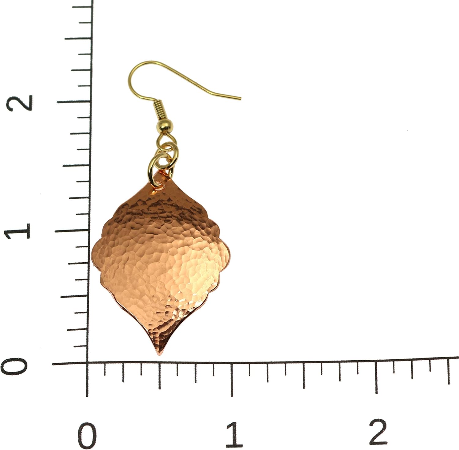 Taking inspiration from Moroccan-inspired jewelry, these Hammered Copper Moroccan Drop Earrings are sure to add plenty of personality to any day or nighttime look. The earrings feature wavy sides that contrast with the pointed bottom, and all across their fronts are hand applied, hammered details that offer just the right amount of texture.The copper earrings measure 2.25 inches in length by 1 inch in width and are incredibly lightweight, making them ideal for all-day wear. Finishing off the copper earrings are the 14 karat gold French ear wires.
