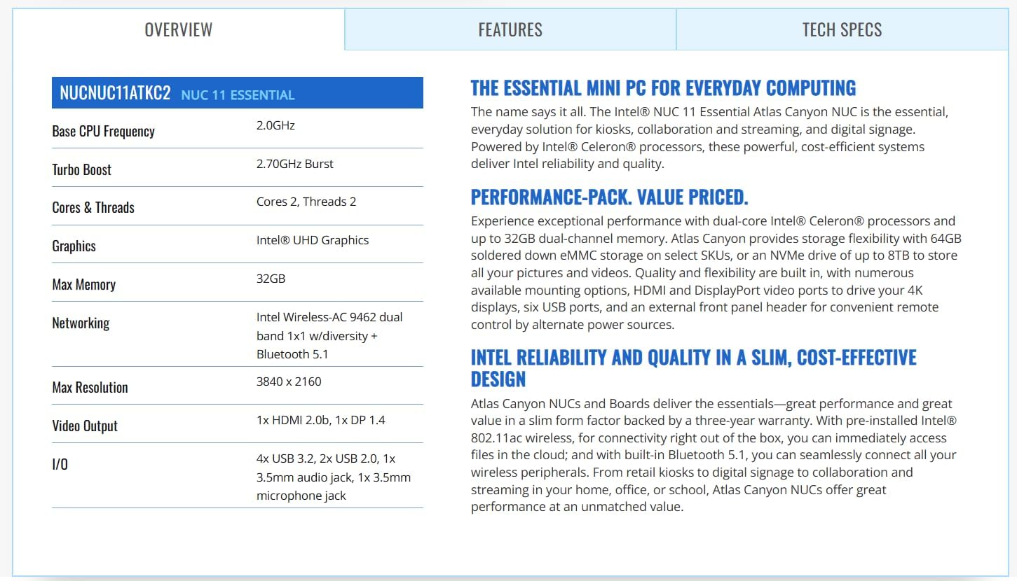 THE ESSENTIAL MINI PC FOR EVERYDAY COMPUTING The name says it all. The Intel NUC 11 Essential Atlas Canyon NUC is the essential, everyday solution for kiosks, collaboration and streaming, and digital signage. Powered by Intel Celeron processors, these powerful, cost-efficient systems deliver Intel reliability and quality.PERFORMANCE-PACK. VALUE PRICED. Experience exceptional performance with quad-core Intel Celeron processors and up to 32GB dual-channel memory. Atlas Canyon provides storage flexibility with 64GB soldered down eMMC storage on select SKUs, or an NVMe drive of up to 8TB to store all your pictures and videos. Quality and flexibility are built in, with numerous available mounting options, HDMI and DisplayPort video ports to drive your 4K displays, six USB ports, and an external front panel header for convenient remote control by alternate power sources.INTEL RELIABILITY AND QUALITY IN A SLIM, COST-EFFECTIVE DESIGN Atlas Canyon NUCs and Boards deliver the essentials—great performance and great value in a slim form factor backed by a three-year warranty. With pre-installed Intel 802.11ac wireless, for connectivity right out of the box, you can immediately access files in the cloud; and with built-in Bluetooth 5.1, you can seamlessly connect all your wireless peripherals. From retail kiosks to digital signage to collaboration and streaming in your home, office, or school, Atlas Canyon NUCs offer great performance at an unmatched value.