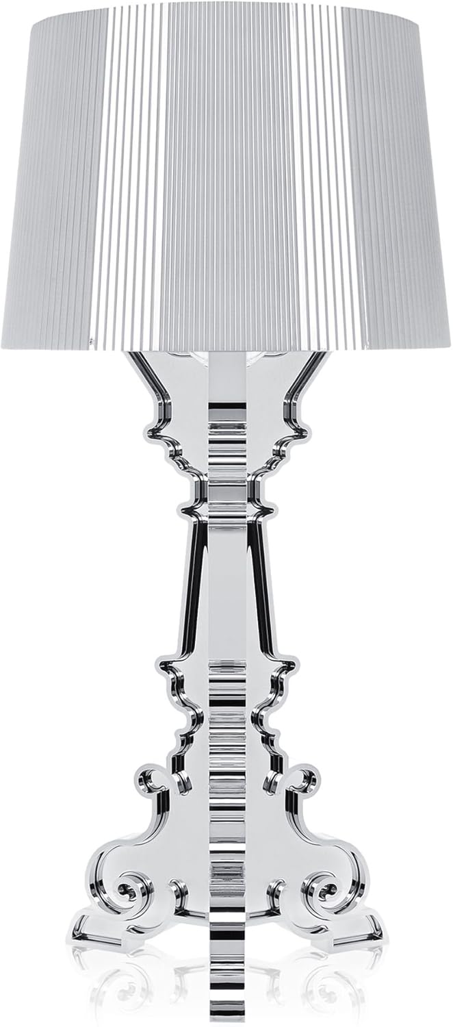 A lamp with an inimitable style, bourgie is one of Kartell best sellers, skillfully combining classic style, richness and tradition with innovation and irony. The baroque style base is composed of three interconnecting decorated layers, while the large lampshade is made with a pleated effect, to create a myriad play of reflections when the lamp is turned on. The lamp shade's unique attachment system makes three different heights possible which can be adjusted according to the desired use: 27, 29 and 31 Inch. Bourgie becomes a gorgeous decorative desk or table lamp. Thanks to its flexibility and strong communication value, it can be used on an side-table in the living room, to create atmosphere on your nightstand, as a standing sculpture or for reading. After the huge success of the transparent, black, gold, silver and white/gold versions, Kartell introduces surprising colored frames, for those who want to flaunt their eclectic and unconventional nature, as well a totally new Copper version.