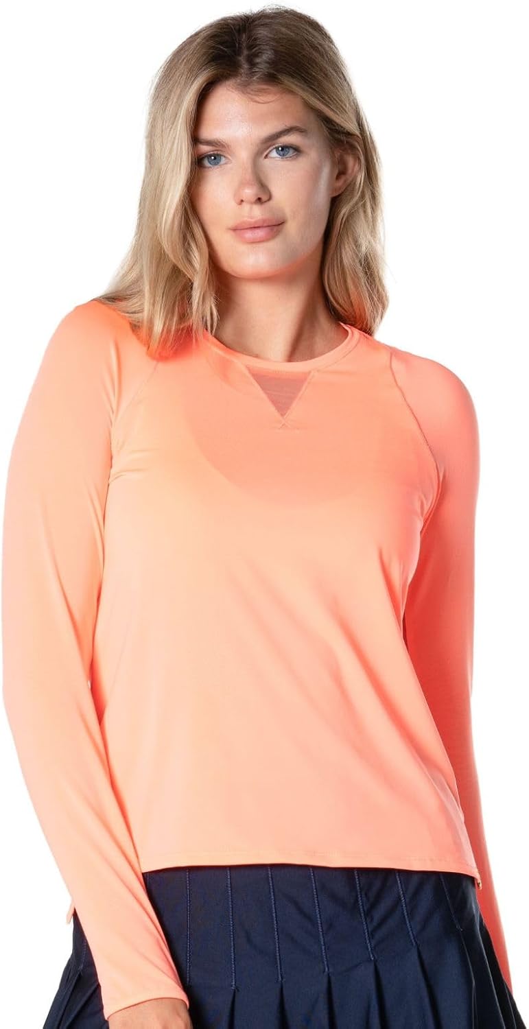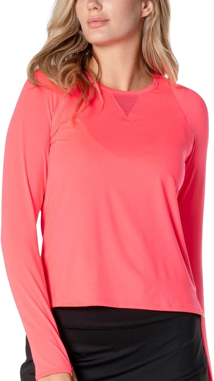 Lucky in Loves new long sleeve with LUV sun protection. This crew neck has a mesh V-neckline and sleeve panel interests for maximum breathability and thumbhole cuffs for additional coverage. Designed to fit along the bust then breaks into an easy fit along the waistline. About Lucky In Love: We are Lucky In Love... an apparel company catering to all racket and country club sports. We're talking about women's athletic wear that performs just as well on the street as it does on the court. Our designs are fashion-forward featuring bright colors, vibrant patterns, and energetic prints that compliment your forehand or do plenty of talking during your backswing. Five generations of sports fashion know-how in family-owned apparel guided us in creating Lucky in Love back in 2010. And since then our goals have remained the same: to create bold performance-wear that strives to be unique and dares to be different. But above all else, we aspire to inspire. To help women of all ages feel amazing so they can venture out into the world as the best versions of themselves, no matter where they sport our clothing. Our collections are sold in boutiques both nationwide and abroad. Yet, wherever you find us, the energy and attitude of our home, Miami, will always be present. We are so thankful to be living our dream. Now, we encourage you to attain your own. To win or lose in style. To feel on top of the world. To be Lucky in Love.