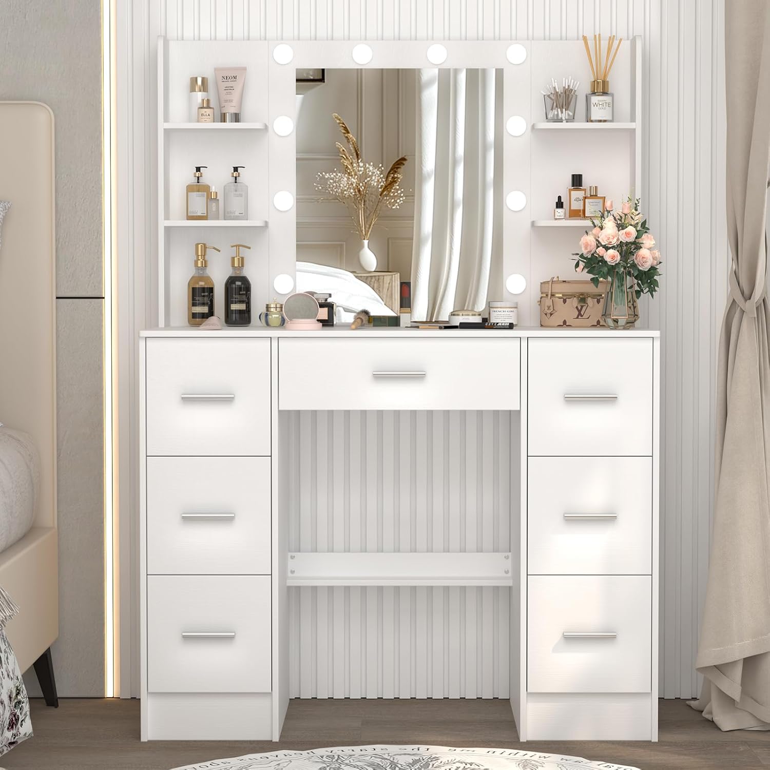 Makeup Vanity Table with Lights, White Dressing Desk with 4 Drawers and 3 Open Shelves, Cute Vanity Set for Bedroom, 3 Lighting Modes Brightness Adjustable * Particle Board, provide a sturdy structure. * Makeup vanity dresser set sliding mirror, adjustable brightness,3 lighting modes :warm yellow, warm white, cold white. * Dressing table makeup desk with 4 drawers. It is a great for wife girlfriend & mom & daughter for birthday. living room & hallway bedroom. Package Content : 1 x Vanity desk, 1 x Stool, 1 x Instruction, 1 x Accessories pack, 10PCS Light bulb --Material : MDF ; Glass --Sliding mirror --10 lights bulbs has 3 color light mode, and the adjustable brightness --Roomy desktop --10 light bulb set --manual