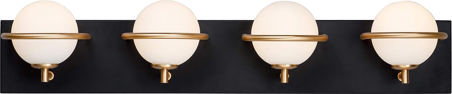 Satin White glass globes are nested behind rings of Gold which dramatically contrasts against the Black metal background. Soft and natural light is provided by replaceable G9 LED lamps which are included in each fixture.