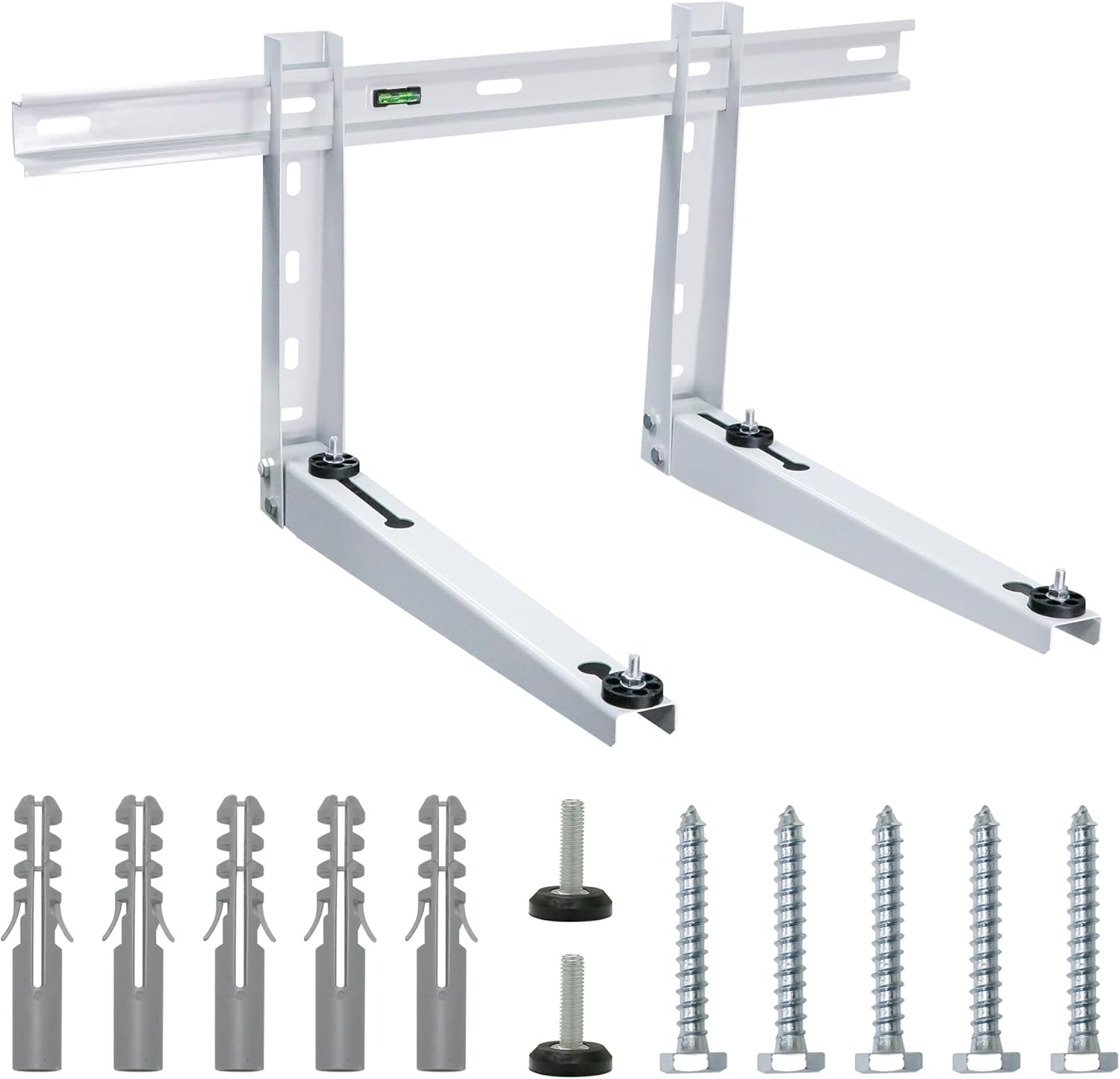 • Additional advantages: Four rubber pads reduce vibration transfer from the unit to the wall brackets, making your AC quieter. The built-in spirit level helps adjust the mounting slope, while angle regulators on the vertical arms allow easy distance adjustment between the bracket and the wall