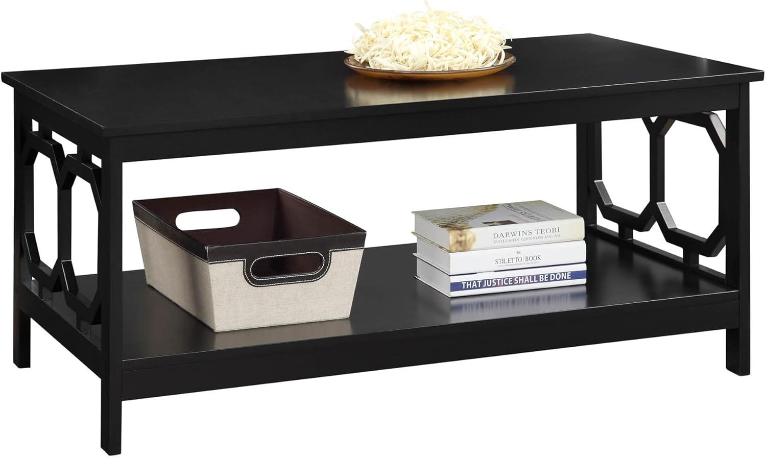 Reinvent your living room with this Coffee Table from Pemberly Row. The simple yet eye-catching design is matched with incredible durability, giving you the best of both worlds. In a rich glossy black finish, it's sure to complement any home décor. This table features a lower shelf that provides usable display space or storage. The durable wood construction provides years of enjoyment. Tools are provided for easy assembly.Features:- Beautiful black wood finish- Bottom Shelf For Additional Storage- Easy Assembly- Tools Provided- Complements any Décor- Will Provide Years of Enjoyment- 17.75" H x 39.5" W x 21.75" DSpecifications:- Product Dimensions: 17.75" H x 39.5" W x 21.75" D- Description_fr: Réinventez votre salon avec la table basse Omega de Convenience Concepts. Son design simple mais accrocheur est associé à une incroyable durabilité, vous offrant le meilleur des deux mondes. Avec sa riche finition noire brillante, elle s'harmonisera avec n'importe quel décor. Cette table est dotée d'une tablette inférieure qui offre un espace d'exposition ou de rangement utilisable. Sa construction en bois durable vous procurera des années de plaisir. Des outils sont fournis pour faciliter le montage.Caractéristiques: Belle finition en bois noirEtagère inférieure pour un rangement supplémentaireMontage facile - Outils fournisCompagnon de tout décorFera des années de plaisir17.75" H x 39,5" L x 21,75" PSpécifications: Dimensions du produit: 17.75" H x 39.5" L x 21.75" PPoids du produit: 33- Title_fr: Concepts de commodité Table basse rectangulaire Omega en finition bois noir- Product Weight: 33- Recommended Location: Indoor- Recommended Room: Living Room