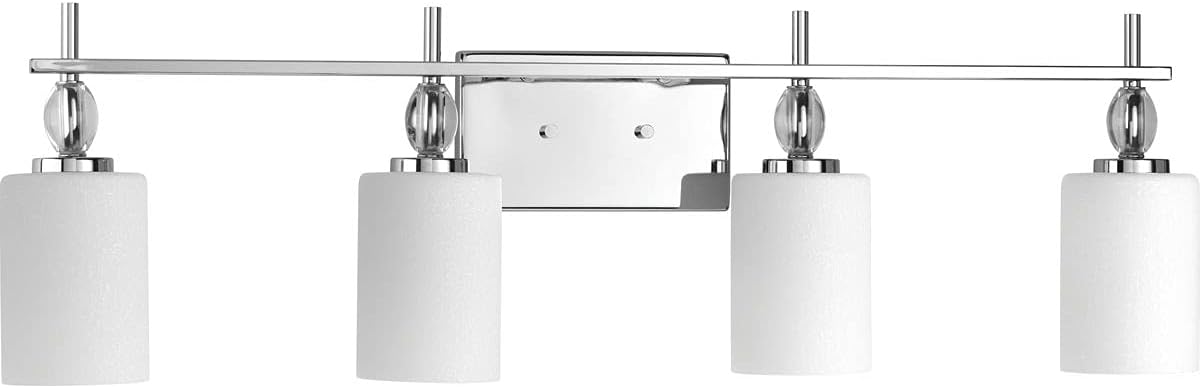Enjoy high status with a four-light bath & vanity full of fun, femininity, glimmer and gleam. K-9 glass accents offer crystal-like clarity to contrast the softened linen-finish glass shades. A Polished Chrome frame provides the perfect support to this elegant combination.