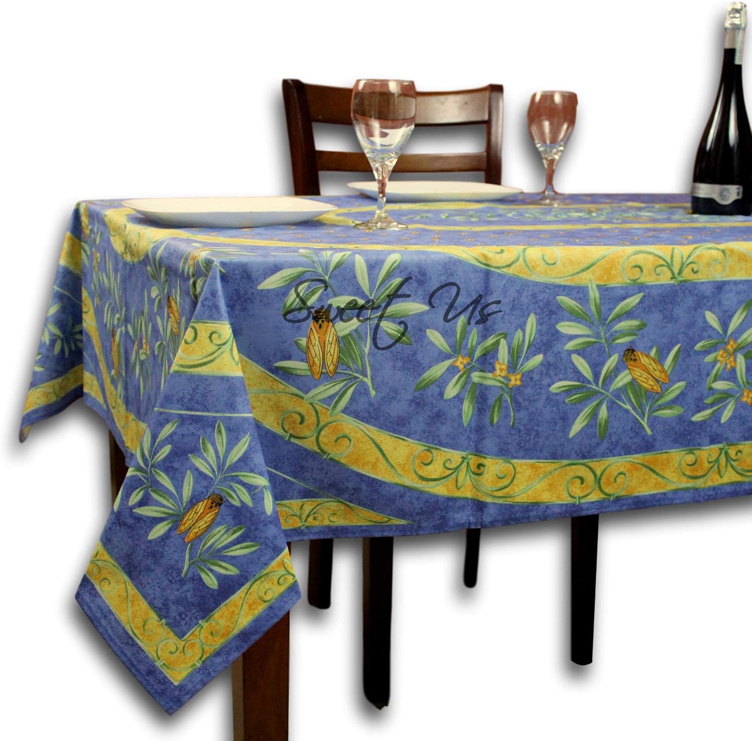 ENHANCE YOUR KITCHEN AND DINING DECORAn amazing French Provencal round tablecloth featuring clusters of delicate flowers with bold yellow cicadas bees intertwined with floral vines all around and along the border intertwined with floral vines in shades of yellow, green on a rich blue background. It is not just beautiful but strong, durable. Bring Provence closer to your home.STAIN RESISTANT SPILL RESISTANT ACRYLIC COATED PREMIUM FABRIC 100% Soft Strong Durable Acrylic Coated Cotton Fabric With Tighter & Smooth Weave That Protects Against Oil and Water Stains, Spills and Color-fading SAFE AND INCREDIBLE FOR EVERYDAY USE AND SPECIAL OCCASIONS Made in Provence, France Tablecloth are good for picnic, camping, wedding, Birthday party, restaurant, buffet, Easter, Thanksgiving and Christmas day PERFECT FOR UP TO 120 INCH LONG RECTANGLE TABLE SUITABLE FOR SEATING 10-12 PEOPLE About 60 x 136 inches Rectangular Tablecloth SUPER EASY CARE Clean with ordinary dish-washing soap & water. Or just WIPE it off with mild dish washing soap and water CUSTOMER SERVICE We stand behind our products. Please contact us if you have any questions and we will do our best to resolve the issue Fine Print: The actual product colors shades may vary slightly from online picture This tablecloth is printed, not quilted or woven. The tablecloth is printed on the front side only. The buyer is responsible for paying customs duty or any other charges incurred in the buyer's home country.