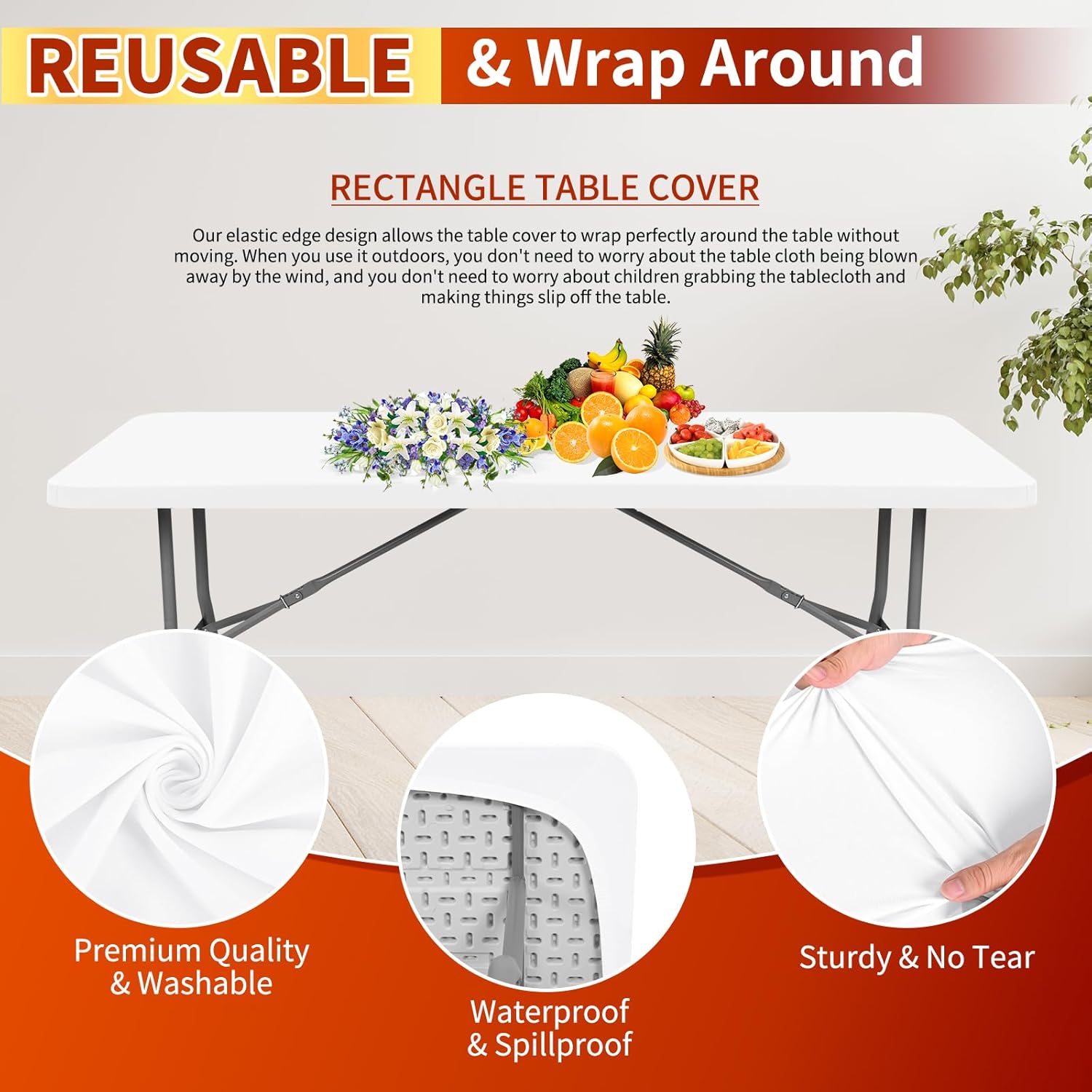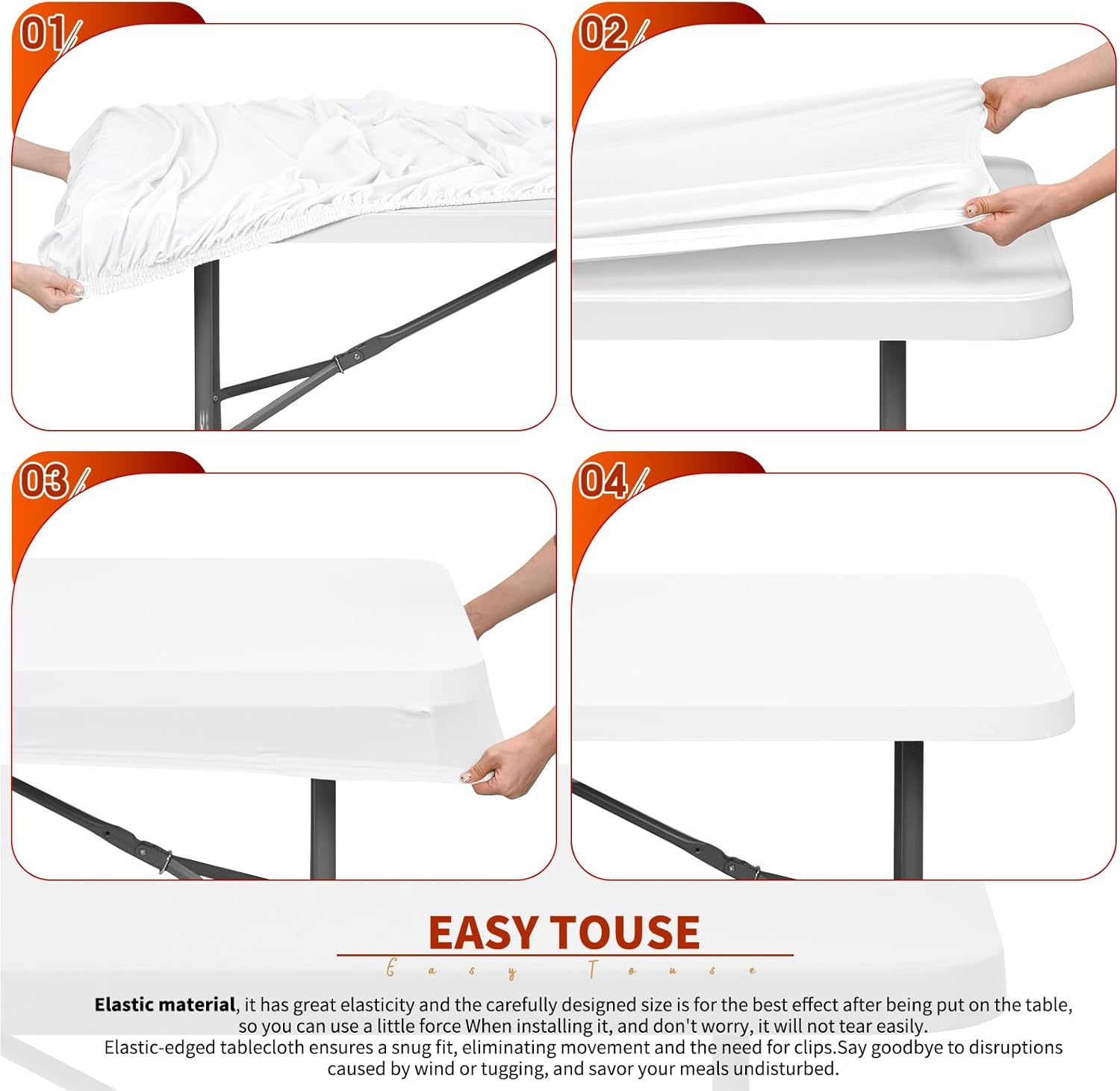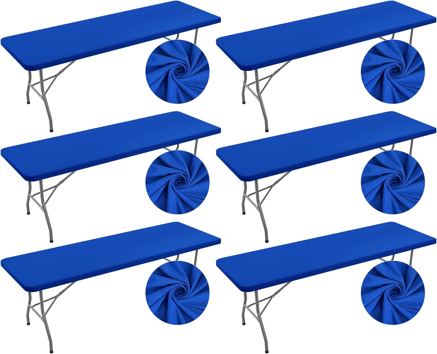 SPANDEX ELASTIC TABLECLOTHS FOR RECTANGLE TABLES 8FTSpecificationQuantity: 6 pieces spandex table covers 8ftColor: WhiteSize: 96 x 30 x 30 inches/ 244 x 76 x 76 cmMaterial: 95% Polyester/5% SpandexFeatures[Well Built & Tear-Proof] The table cover is featuring premium polyester fabric, solid and sturdy. It is not easy to tear when you pull it, and keep it the way during use.[Windproof & Elastic Edge] Our tablecloth's elastic edge design ensures a snug fit, eliminating the need for pesky clips or clamps. It stays firmly in place, even on breezy days.[Waterproof & Easy Care]Engineered with a waterproof design that causes liquids to bead on its surface, simply wipe with a damp cloth to remove spills or stains, or machine wash, guaranteeing a fresh look.[Versatile & Elegant] The classic solid color design of these polyester tablecloths make them versatile for various occasions—from casual family dinners to formal celebrations, such as picnics, campings, BBQ, diners, parties, banquets, birthday, weddings, restaurant, indoor and outdoor.Warm notices1.Please confirm table size carefully before ordering.2.Please allow slight size errors due to manual measurement.3.There might be a little color difference due to the monitor, camera or other factors, please refer to the physical items.Our ServiceWe provide satisfactory customer service. If you have any questions about this product, please feel free to contact us.For quality related issues, a replacement or refund is allowed.We will guarantee to reply within 24 hours and give you a satisfactory solution.