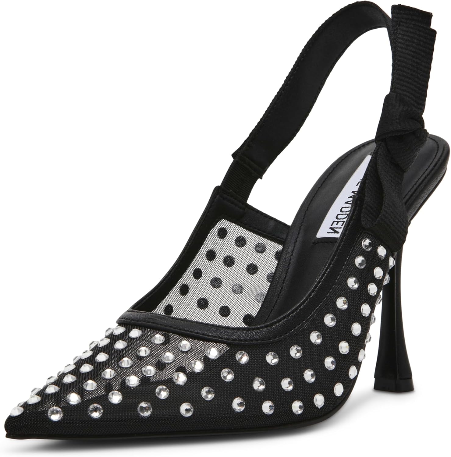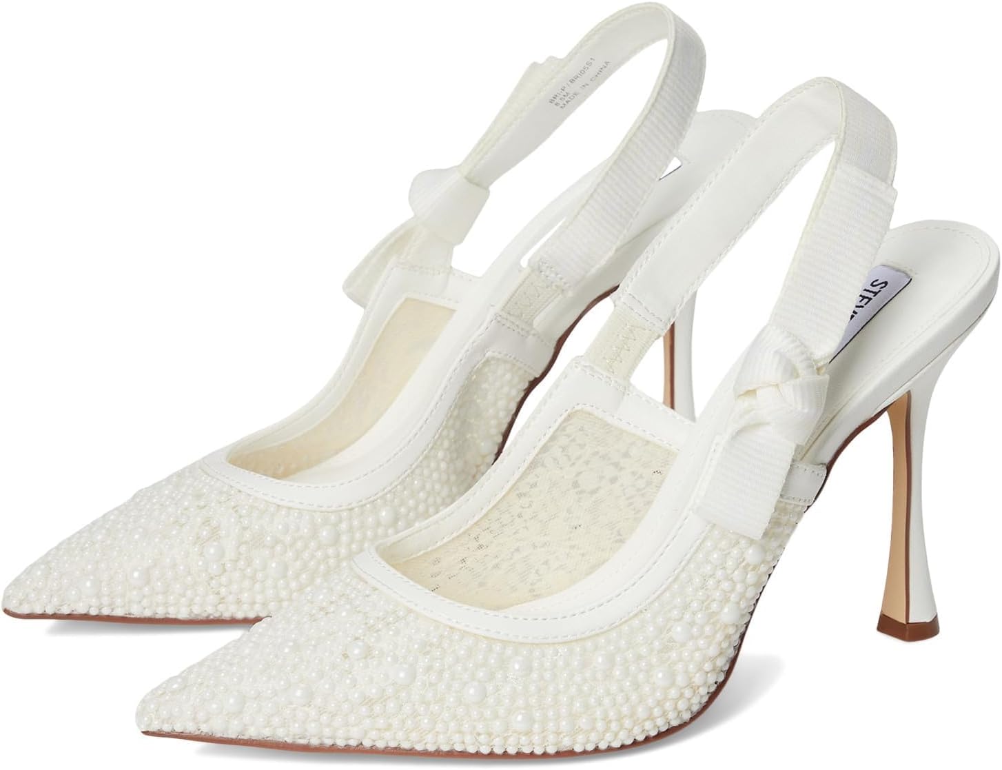 A grosgrain ribbon wraps around the slingback strap of the BRI point toe stiletto pump and finishes with a bow accenting the side of the shoe.